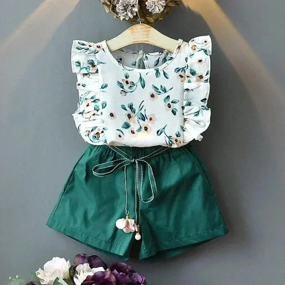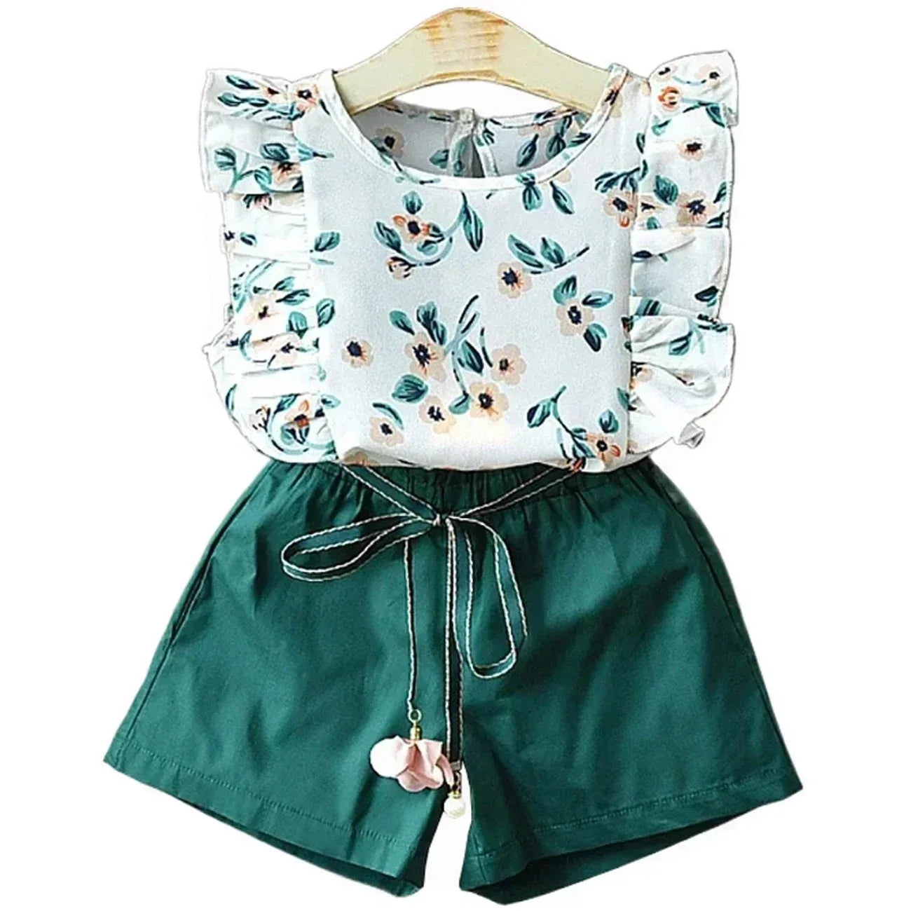 Kids Clothes Girls Set Sleeveless T-shirt+Shorts 2PCS/Sets Baby Girls Clothes Chiffon Shirt Flower Print Children Girls Clothes