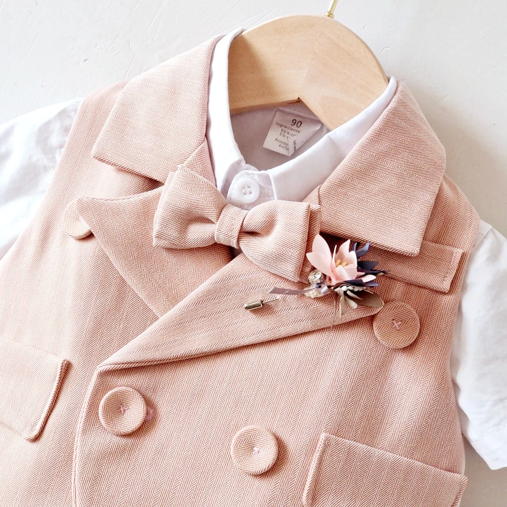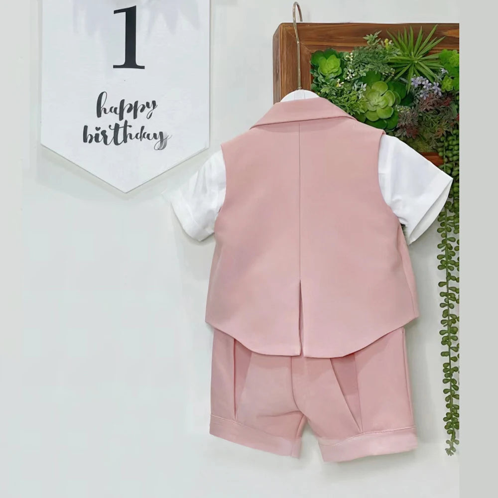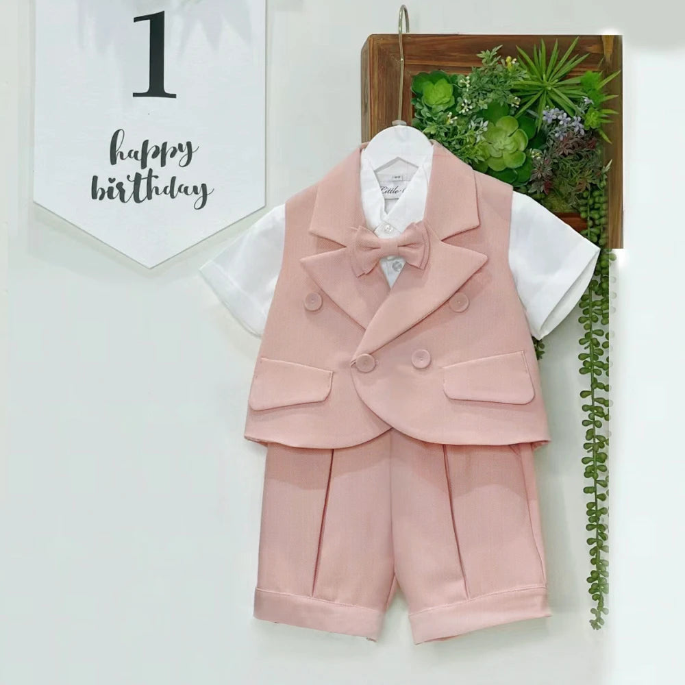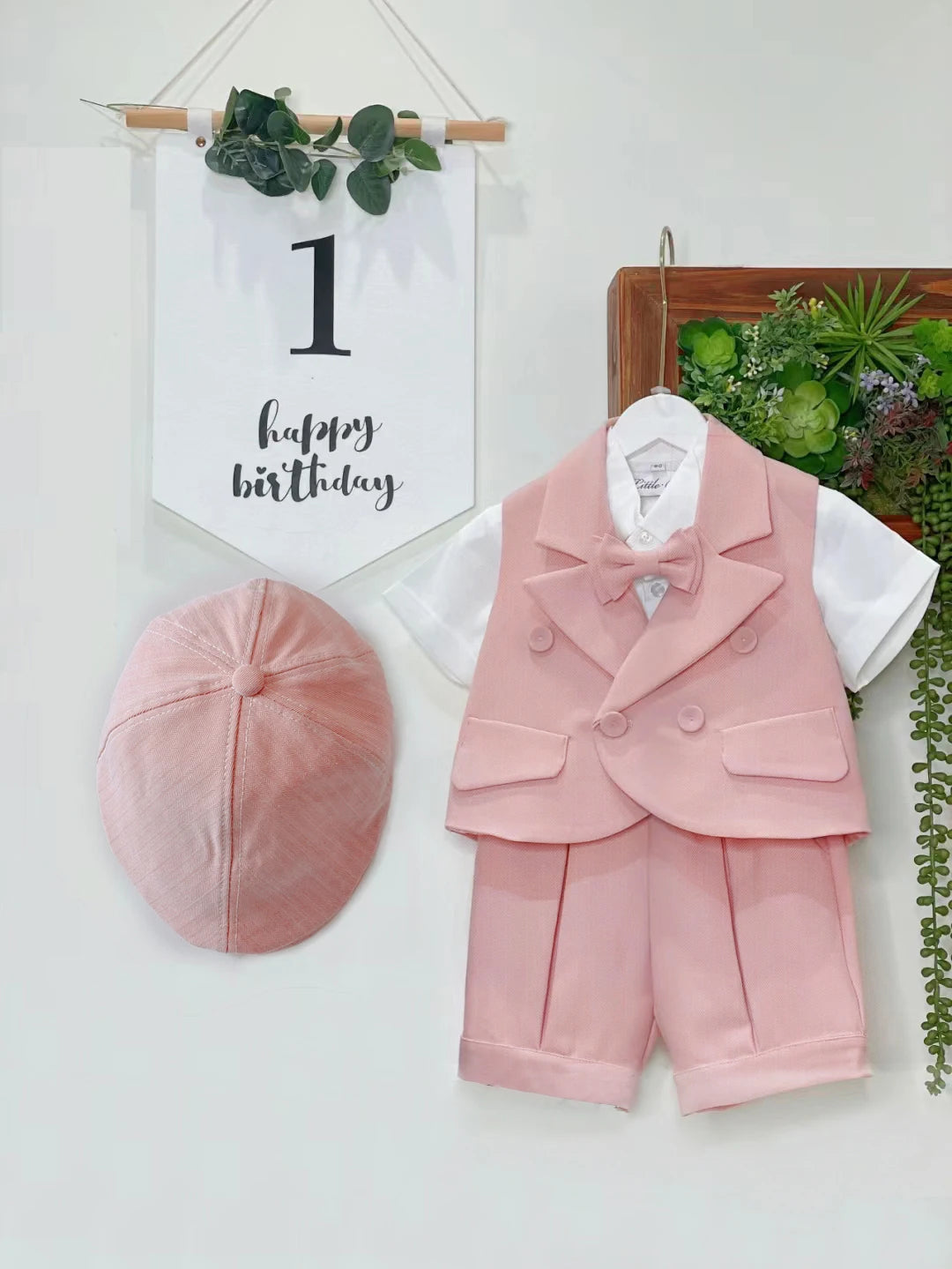 Kids Clothes Pink Boys Suit 3 Piece Vest Short Tiebow +Hat Clothing Set Tuxedo Kids Fashion Custom 1-4 Years Birthday Dress