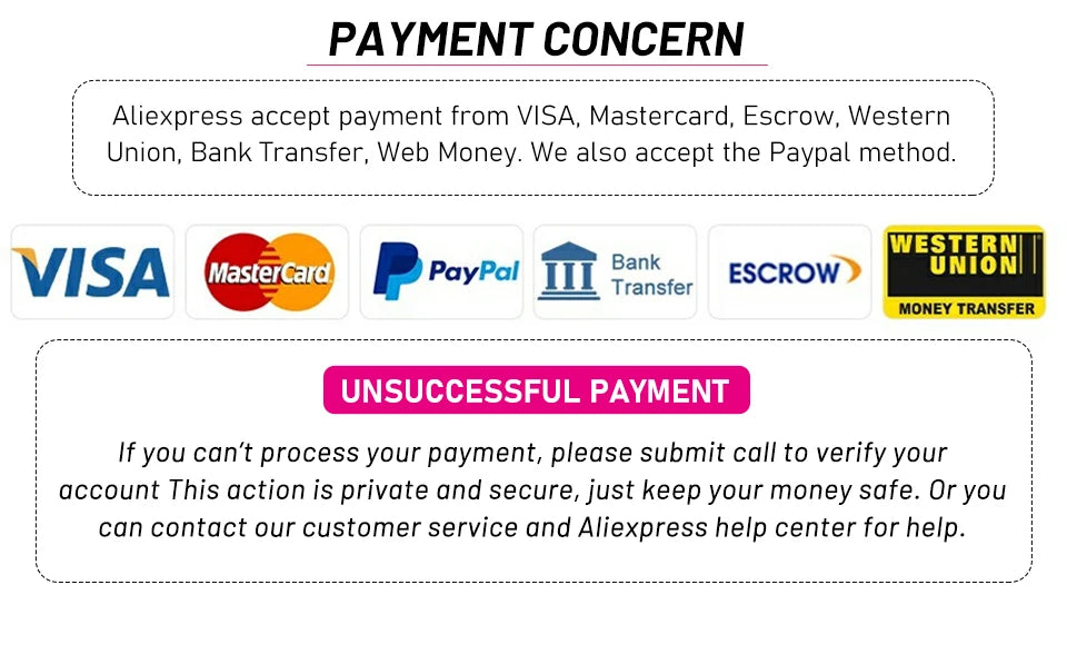 A: AliExpress accept Credit Card, Bank Transfer (TT), Western Union,Money Bookers For payment detail payment failed, please contact us, wewill guide you how to pay